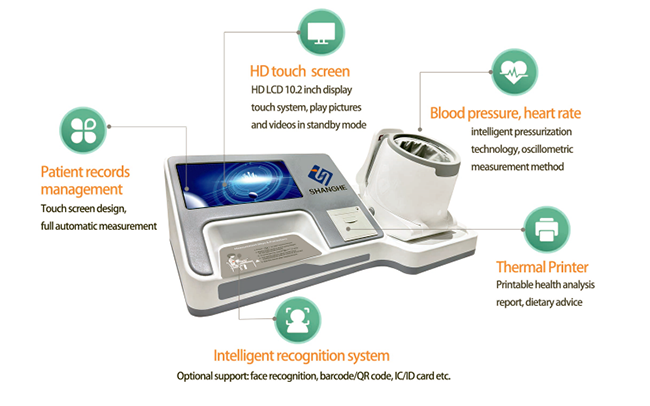 | Optional expansion | Blood oxygen, blood sugar, body temperature, alcohol test, psychology, traditional Chinese medicine constitution, ID card, social security card, bank card, IC/ID card, bracelet, scanning code (QR code, barcode), WeChat, Alipay payment, etc. |
