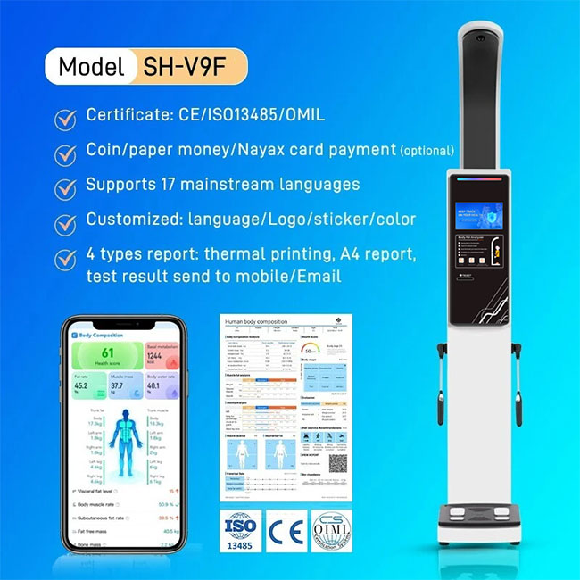 Multi-frequency bioelectrical impedance test 8-point contact electrode, multi-frequency bioelectrical impedance (BlA) Frequency:20KHz.100KHz Impedance measurement range: 10-2000Q Current: ≤420+20μA Applicable Age: 6-99 years old Duration:si minute Segments: 5 parts (left arm, right arm, trunk, left leg, right leg) |