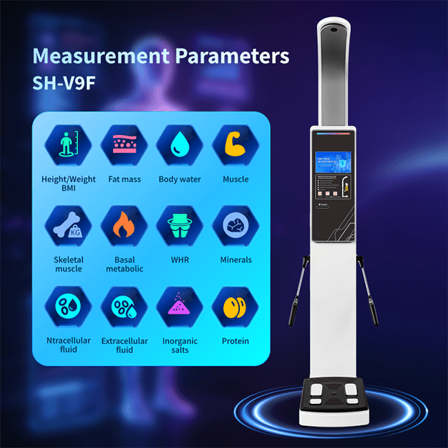 The SH-V9F Body Composition Analyzer can measure height, weight, BMI, and perform over 35 body composition analyses.It employs a high-precision millimeter-wave sensor, a 500kg ultra-large weighing sensor, and 8-point contact electrodes to ensure stable and rapid measurements.It features a 10.2-inch high-definition LCD screen with intelligent voice/animation prompts and can also play promotional videos and images.Measurement results can be viewed via three methods: thermal printing, A4 printing, and mobile phone QR code scanning, facilitating regular measurements and long-term management.
